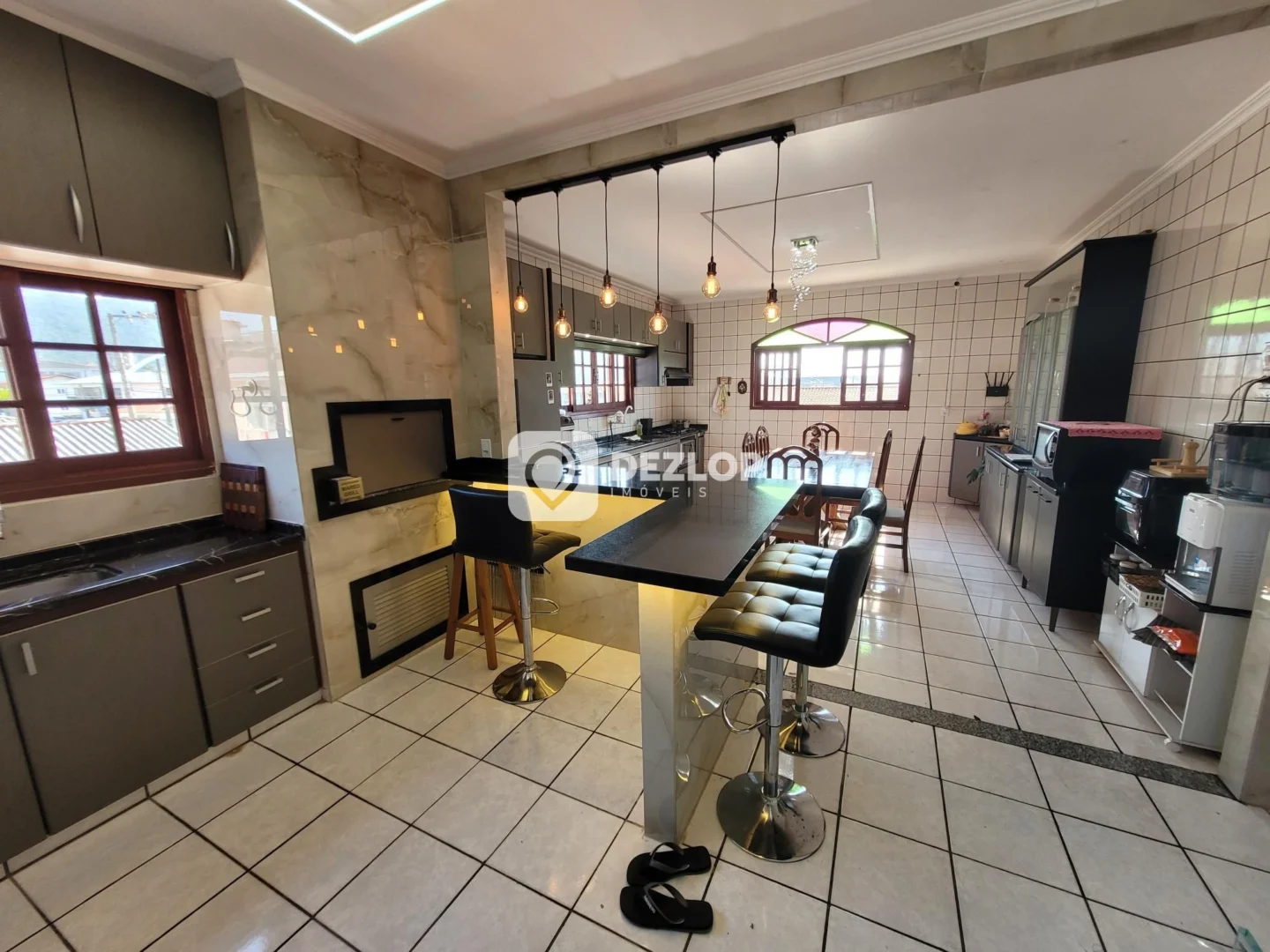 A cozinha, um dos pontos altos desta casa, é grande e já vem equipada com móveis planejados e armários, otimizando o espaço e facilitando a organização. A presença de uma cozinha gourmet é um convite a momentos de descontração e celebração, ideal para quem aprecia culinária e receber amigos e familiares. Para maior praticidade, a casa também conta com uma área de serviço bem definida, um lavabo e uma escada que proporciona acesso aos demais ambientes.
