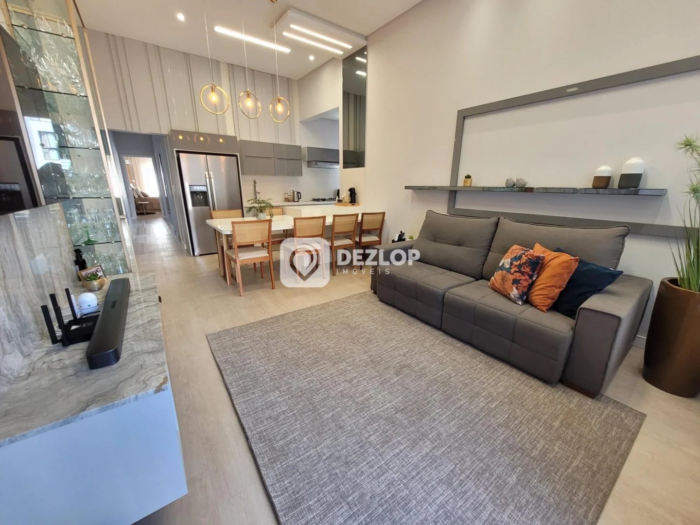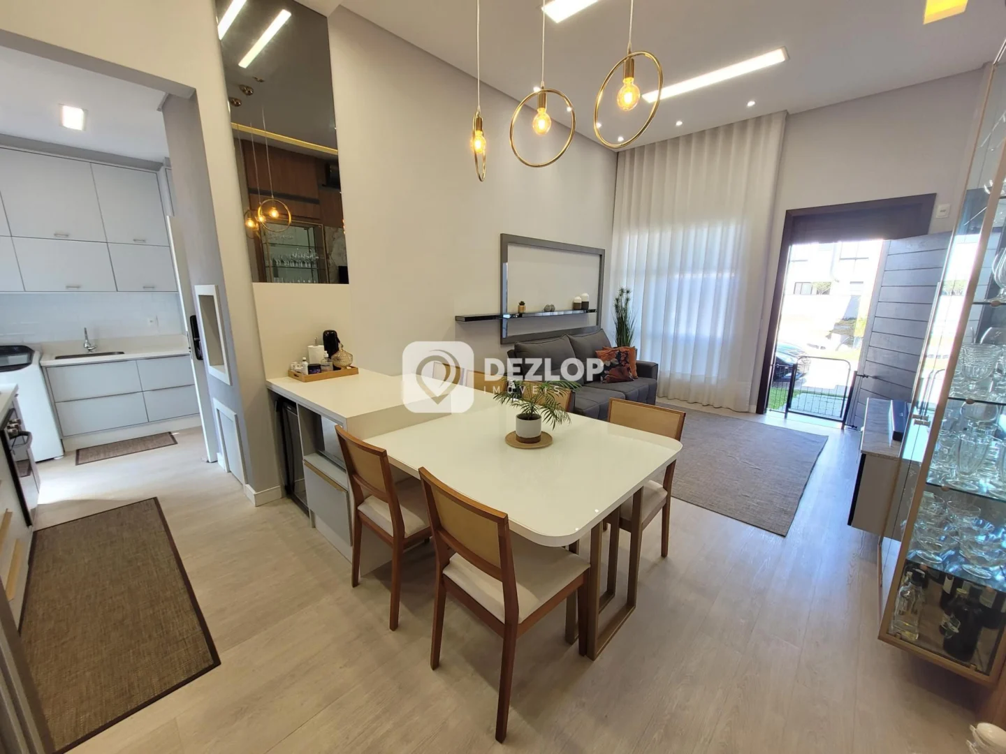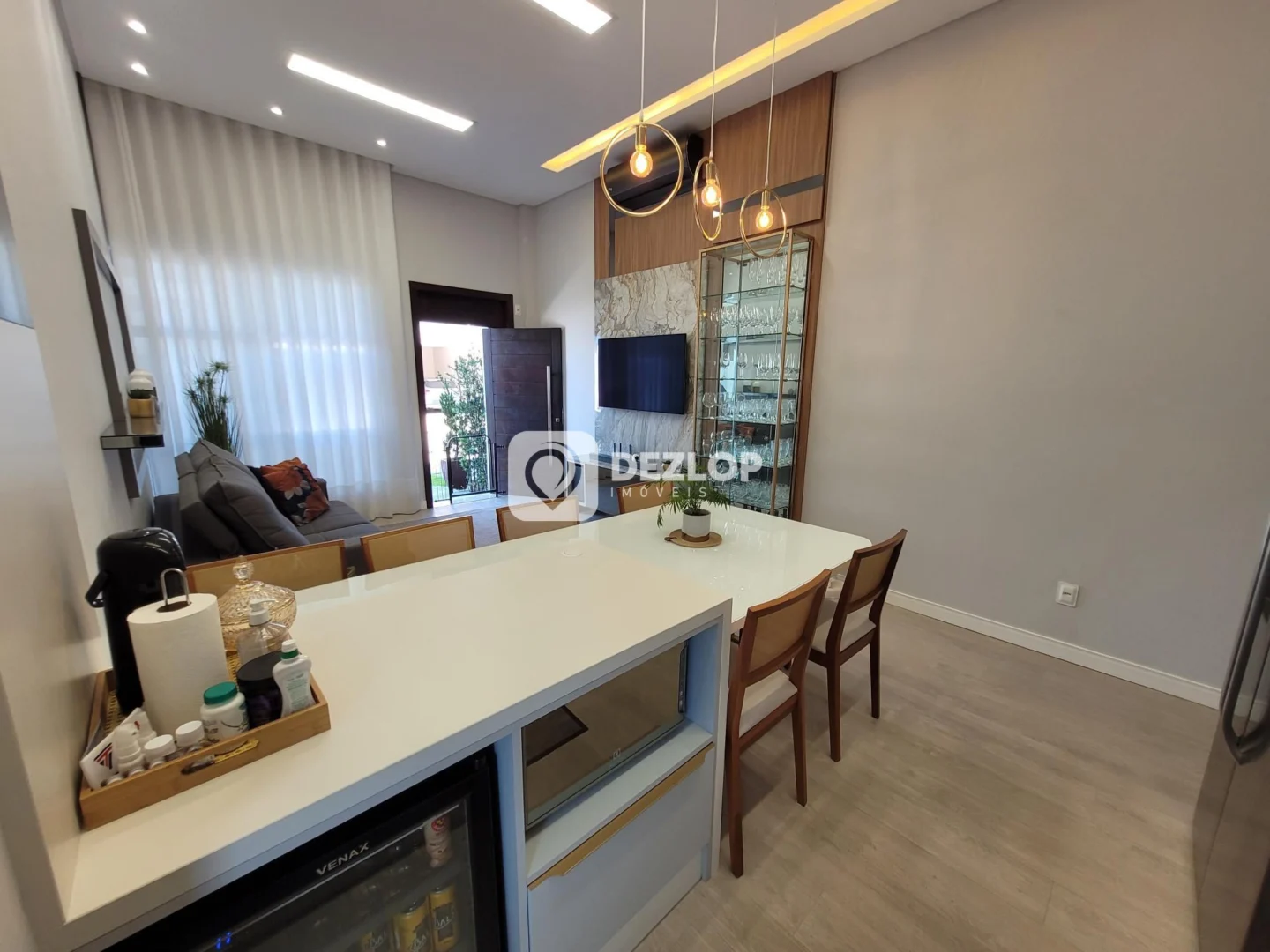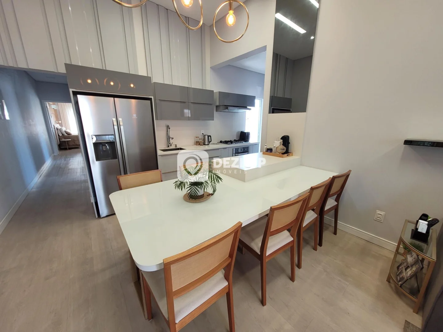 O interior da casa foi pensado para otimizar o espaço e a iluminação natural. A suíte master, com seu banheiro privativo, oferece um refúgio de relaxamento e privacidade. Os demais quartos são amplos e bem arejados, perfeitos para acomodar a família ou receber visitas. Os banheiros social e da suíte foram projetados com atenção aos detalhes, utilizando materiais de alta qualidade e acabamentos elegantes. A cozinha, equipada com armários planejados, proporciona um ambiente funcional e organizado para o preparo das refeições. A área de serviço, estrategicamente posicionada, facilita a rotina diária. A sala de estar e a sala de jantar, integradas, criam um espaço acolhedor para momentos de convívio e celebração. O pé direito elevado contribui para a sensação de amplitude e luminosidade em todos os ambientes. O piso em porcelanato e vinílico garante beleza e durabilidade, além de facilitar a limpeza e manutenção.