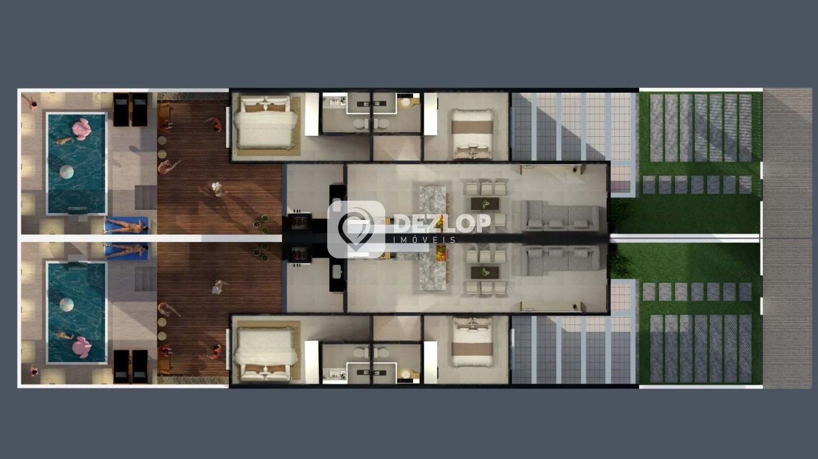 A distribuição interna foi pensada para otimizar o espaço e promover a integração entre os ambientes. A sala de estar, a sala de jantar e a sala de almoço se conectam, criando um espaço amplo e convidativo para momentos de convívio e celebração. A cozinha, projetada para facilitar o preparo das refeições, se integra ao espaço gourmet, perfeito para reunir amigos e familiares em momentos especiais. A área de serviço oferece praticidade e funcionalidade, enquanto o quintal proporciona um espaço ao ar livre para relaxamento e lazer.